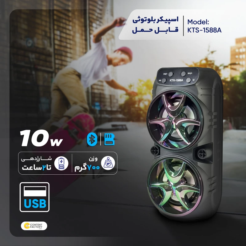 با توجه به وزن کمتر از یک کیلوگرم یا به طور دقیق 700 گرم اسپیکر بلوتوثی قابل حمل مدل KTX-1588A، حمل این اسپیکر برای همه آسان است. در بخش درگاههای ارتباطی شاهد شیار کارتحافظه از نوع TF CARD هستیم که بیش از ظرفیت 32 گیگابایت را پشتیبانی نمیکند. همچنین پورت کاربردی USB برای پخش فرمتهای صوتی MP3 را میتوان در این بخش دید. متاسفانه در این مدل و حتی مدلهای B و C از جک 3.5 میلیمتری خبری نیست. یک پورت Micro USB برای شارژ کردن دستگاه دیده میشود و در سمت دیگر این پنل، دکمه روشن خاموش دستگاه به کار رفته است. کلیدهای مدیریتی همانطور که اشاره شد در نمای جلو قرا گرفته است. این کلیدها شامل تغییر حالتهای مختلف یا MODE است که با حرف M خودنمایی میکند، کلید پخش و توقف موسیقی، رفتن به ترک قبلی و بعدی و بیس بوست دیده میشود. خوشبختانه کلیدها قابلیت پشتیبانی از فرامین دوگانه را دارند، به این صورت که از کلیدهای ترک قبلی و بعدی میتوان برای کنترل حجم صدا هم استفاده کرد. البته در این میان نباید فراموش کرد که مهمترین نوع ارتباط در این مدل از اسپیکرها، بلوتوث است. این اسپیکر هم با بلوتوث نسخه 5.0، ارتباط سریع، پایدار با مدیریت آسان را در اختیار خریداران قرار میدهد.