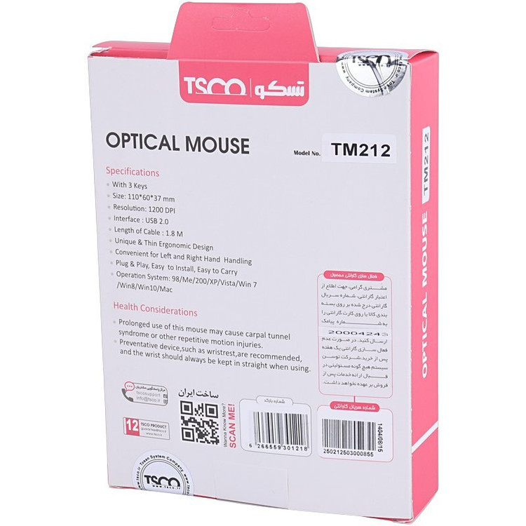 موس TSCO TM-212 محصول شرکت ایرانی تسکو است که با داشتن اندازه ای مناسب و ظاهری زیبا می تواند یک موس مناسب برای شما باشد. موس TSCO TM-212 با داشتن دقت ۱۰۰۰ dpi برای استفاده برای کار های روزمره یا کار های اداری مناسب است. اتصال این موس به صورت سیمی توسط رابط USB2.0 انجام می شود. طول سیم این موس ۱٫۵ متر است و می تواند استفاده شما از این موس را راحت کند. موس TSCO TM-212 دارای ۲ کلید کلیک معمولی و یک کلید چرخشی به علاوه یک دکمه دبل کلیک است. موس تسکو TM-212 از تمام سیستم عامل ها پشتیبانی می کند و شما می توانید موس خود را به هر کامپیوتری صرف نظر از سیستم عامل آن متصل کنید.