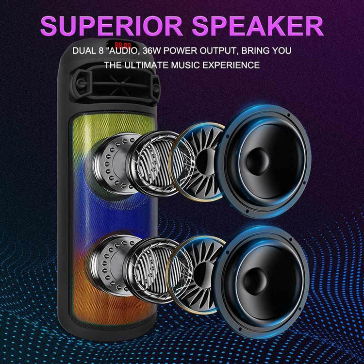 مجهز به 2 عدد درایو 8 اینچی با توان خروجی کلی 36 وات، دارای 2 عدد درگاه ورودی میکروفون
