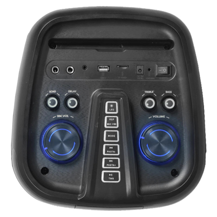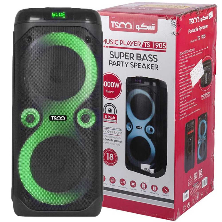 جدید ترین پارتی باکس تسکو با پشتیبانی از قابلیت KARAOKE این امکان را به تمام کسانی که علاقهمند به خوانندگی هستند میدهد که با حذف صدای خواننده با موسیقی مورد علاقه شان همخوانی کنند و شور و هیجانی بیشمار به دورهمی های دوستانه خود ببخشند. پارتی باکس TS 1905 در ابعاد 61×26×26 سانتی متر و وزن 6.3 کیلوگرم در رنگ مشکی طراحی و تولید شده است،در قسمت بالایی این اسپیکر پنل تنظیمات اسپیکر تعبیه شده که شامل دکمههای پاور، تغییر حالت نورپردازی LED ها، تنظیم ولوم، تعویض آهنگ، قابلیت TWS، قابلیت ضبط صدا، ورودی های میکروفن، پورت usb و نمایشگر ledمیباشد. این پارتی باکس جذاب اتصال از طریق پورتusb ،شیار کارت حافظه،خروجی aux، و بلوتوث نسخه ی 5.0که برد مفید آن بالغ بر 8 متر است را پشتیبانی میکند. یک باتری لیتیومی 7200 میلی آمپر ساعت تامین کننده ی انرژی مورد نیاز این پارتی باکس کاربردی است که در مدت زمان 8 ساعت به طور کامل شارژ شده و به مدت 3 ساعت بی وقفه قابل استفاده میباشد. این پارتی باکس با قدرت تفکیک صدای 30hz_20khz، دامنه فرکانس 88mhz_108mhz، توان واقعی 30 وات، وضوح صدای 78db و نورپردازی های RGB جذاب یکی از با کیفیت ترین پارتی باکس های برند تسکو به شمار می اید. از اقلام همراه پارتی باکس TS 1905 میتوان به ریموت کنترل،میکروفن بی سیم و آداپتور اشاره کرد.
