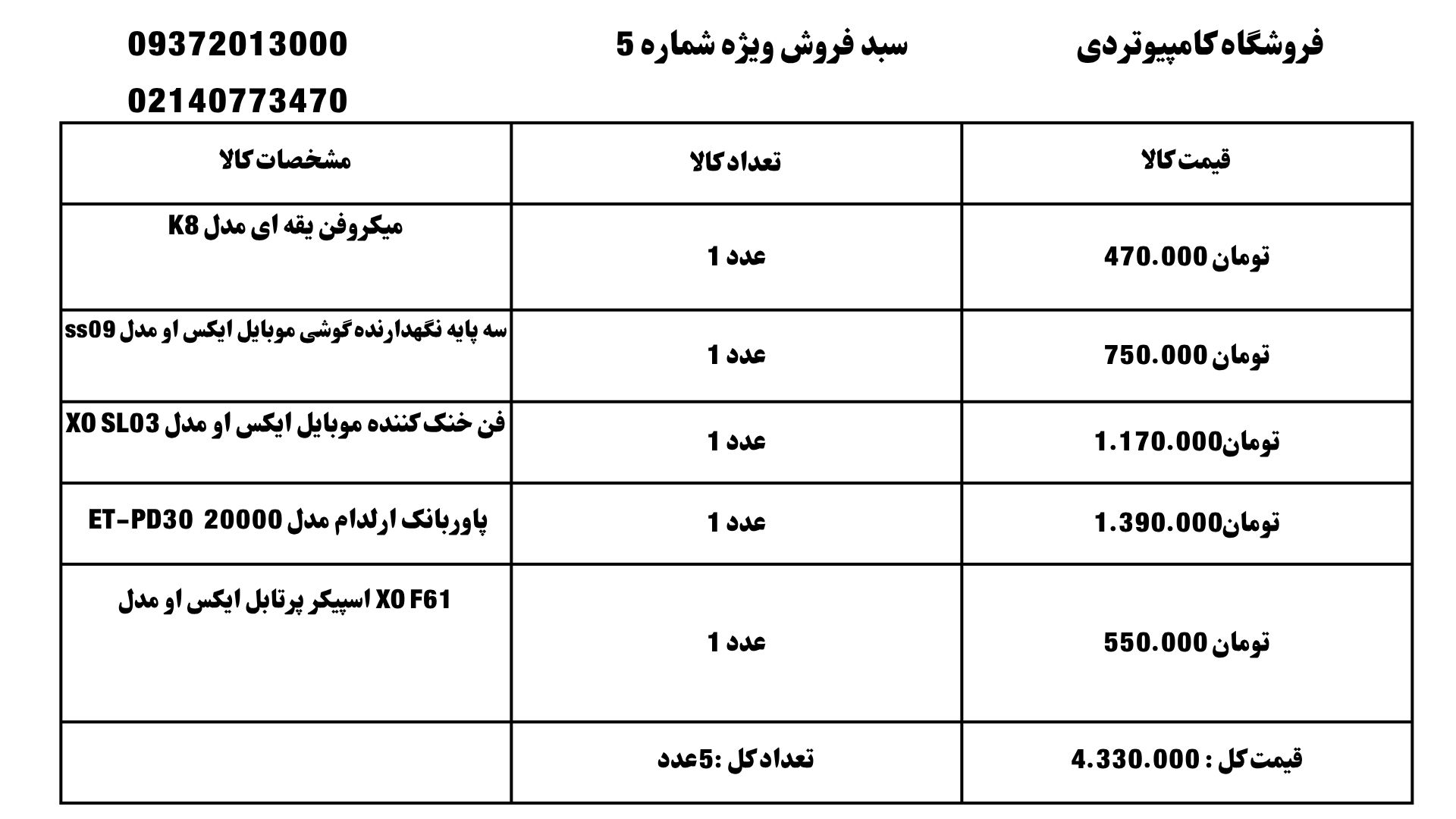 سبد خرید شماره 5 شامل( پاوربانک 20 هزار/میکروفون یقه ایی/اسپیکر پرتابل/فن خنک کننده گوشی موبایل/پایه نگه دارنده موبایل)