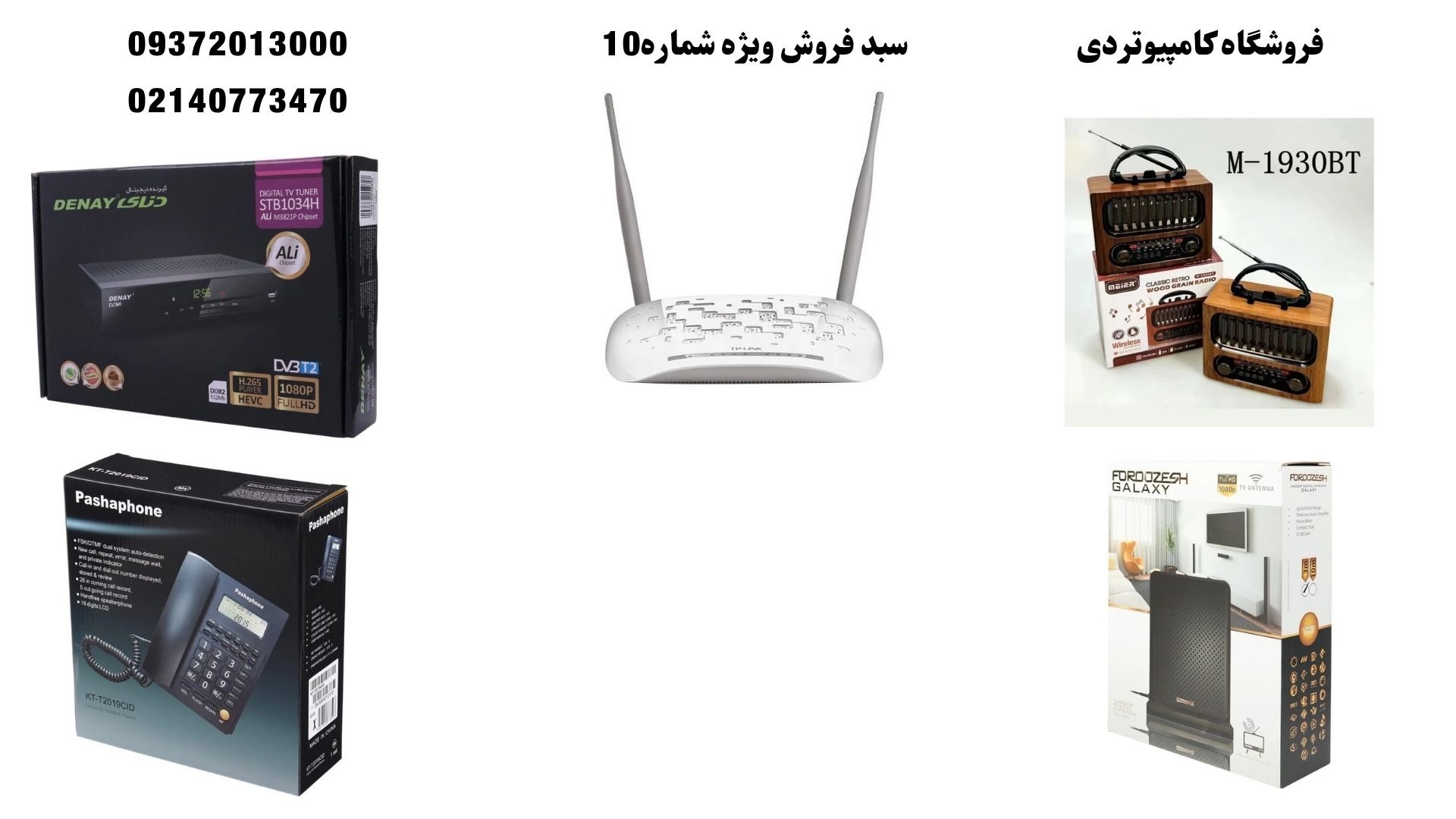 سبد خرید شماره 10 شامل(گیرنده دیجیتال دنای/آنتن رومیزی فروزش/تلفن رومیزی/رادیو اسپیکر اصلی/مودم ADSL)