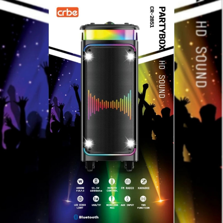 اسپیکر قدرتمند CRBE CR-۲۸۵۱ انتخابی ایدهآل برای کسانی است که به صدای بلند، بیس قوی و طراحی جذاب اهمیت میدهند. این پارتی باکس با توان خروجی ۶۰۰۰ وات P.M.P.O و باتری قدرتمند ۶۰۰۰ میلیآمپری (۱۱.۱V) تجربهای طولانی و پرانرژی از پخش موسیقی را فراهم میکند. نورپردازی LED دیسکو با افکتهای رنگی هماهنگ با موسیقی، فضای هر مهمانی را به اوج هیجان میرساند. همچنین وجود قابلیتهای کارائوکه (Karaoke)، میکروفون بیسیم و ریموت کنترل، آزادی عمل و سرگرمی بیشتری در اختیارتان میگذارد. این اسپیکر از طریق بلوتوث، USB، TF Card و AUX با دستگاههای مختلف سازگار است و با پشتیبانی از TWS میتوانید دو اسپیکر را بهصورت همزمان متصل کرده و صدایی فراگیرتر ایجاد کنید. 🎉 ترکیبی از قدرت، نور و کیفیت صدا برای یک جشن تمامعیار!